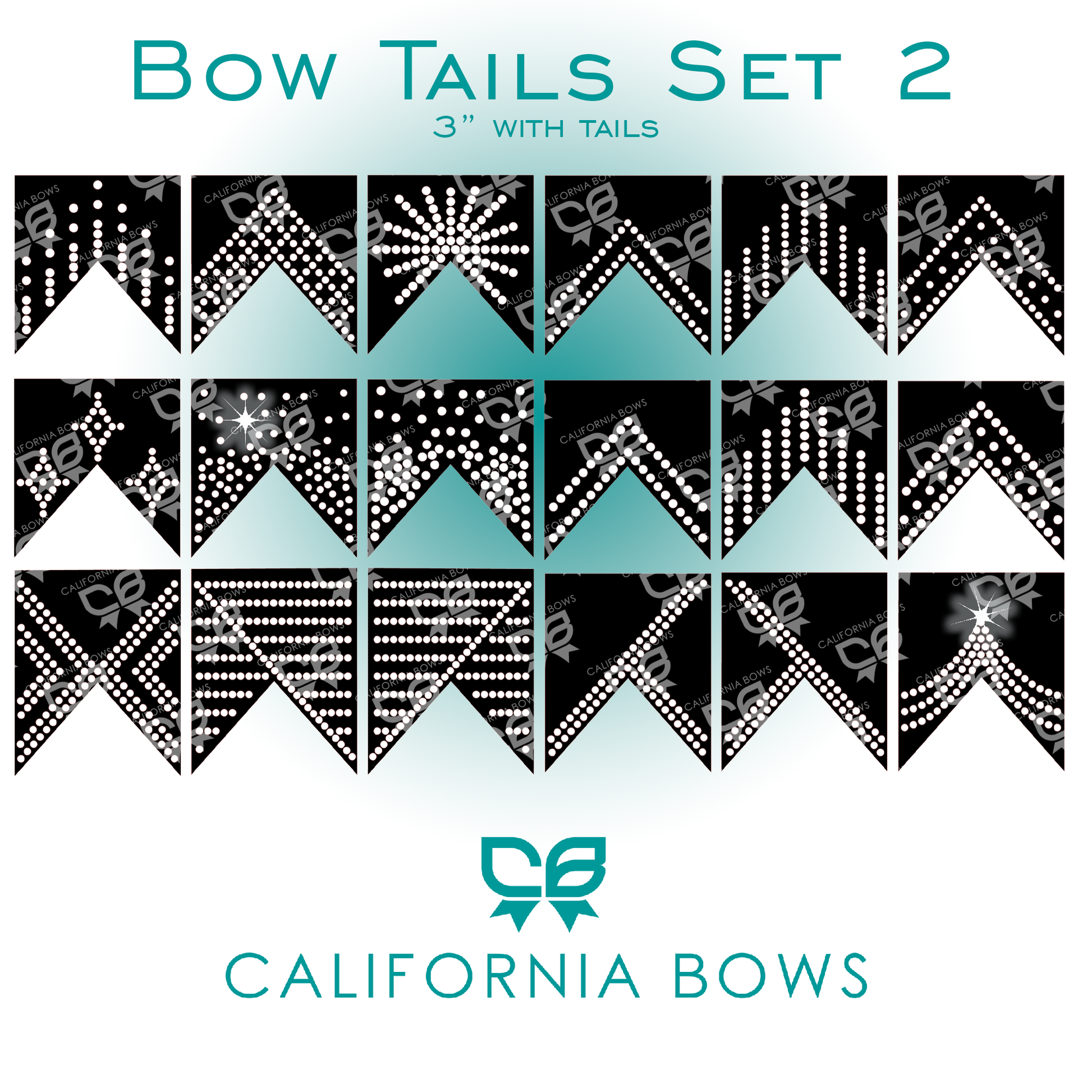 These bow tails have been created to be used on 3" ribbon or fabric bow. You will need: - hot fix rhinestones (6ss, 10ss and 16ss) - rhinestone template material - machine that will cut templates (Cricut, Silhouette, etc.) There are not returns on digital products so please make sure your software and machine are compatible with the file formats. You MAY use this template to create bows for personal/team use OR to sell but you MAY NOT sell the template as a file or physical product.
